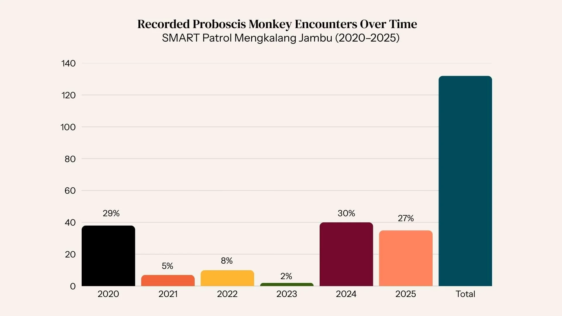 Recorded proboscis monkey encounters over time based on SMART Patrol data from Mengkalang Jambu (2020–2025).